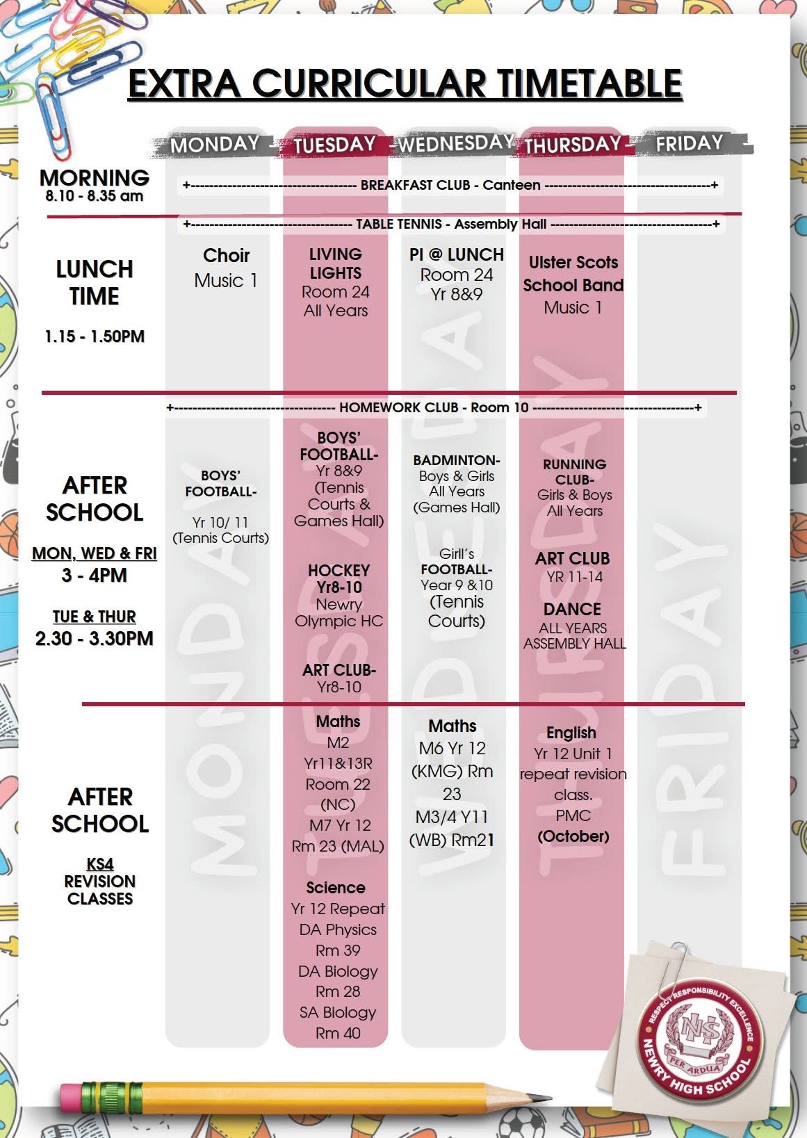 Extra-curricular activities are hugely valuable to young people in ways that are not quantifiable. Extra-curricular activities boost young people’s confidence to interact socially with others; extend their social networks; and provide them with new skills and abilities. Above all, they offer an important space to have fun and relax away from the pressures of school work. These more qualitative benefits must not be discounted, especially in the context of contemporary challenges around young people’s mental health and well-being.Therefore, at Newry high School we strive to provide and extensive range of extra-curricular activities. For the most updated timetable please click the button below: